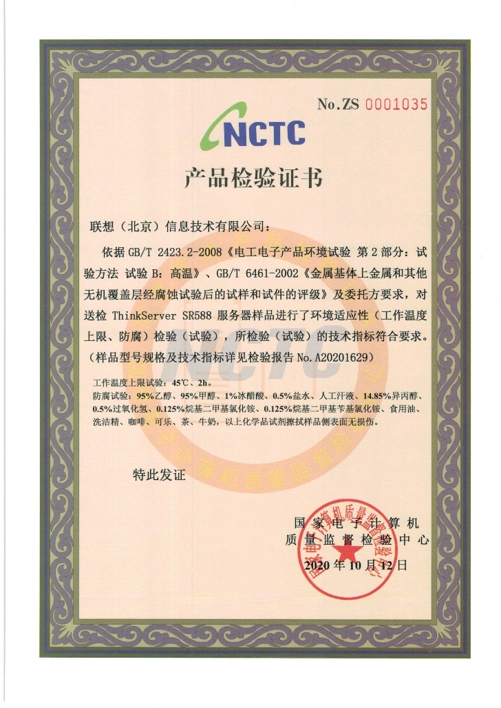 近日,联想ThinkServer TS80X和ThinkServer SR588两款服务器分别通过了中国电子计算机质量监督检验中心的NCTC认证。NCTC是获得国家质量监督检验检疫总局、国家认证认可监督管理委员会和信息产业部授权承担计算机产品质量国家或行业监督抽查的专业质检中心。在这次对联想ThinkServer TS80X和ThinkServer SR588两款产品的检测中,NCTC是在对该服务器的恶劣环境适应性及性能和功能技术指标方面,进行了严格测试后颁发的证书。