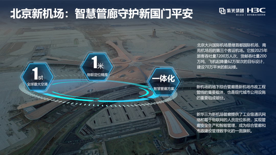 而在航站楼的数字化改造之外,新华三集团更在这座机场的地下深处谋划布局,为机场和周边居民打造了一条看不见但却不可缺少的地下智慧管廊。作为北京大兴国际港务区的配套项目,大兴新航城地下管廊承担着新机场区域回迁居民用电、用水、燃气与信号的输入,是新机场回迁居民的生命线,更是新机场建设的基础工程。在这个全国首个智慧物联管廊试点工程的建设中,新华三基于物联网技术打造的人员定位解决方案,实现了精准的人员定位、电子围栏管理、应急告警和统计等创新功能,以科技智慧助力大兴机场创立航站建设新标杆。