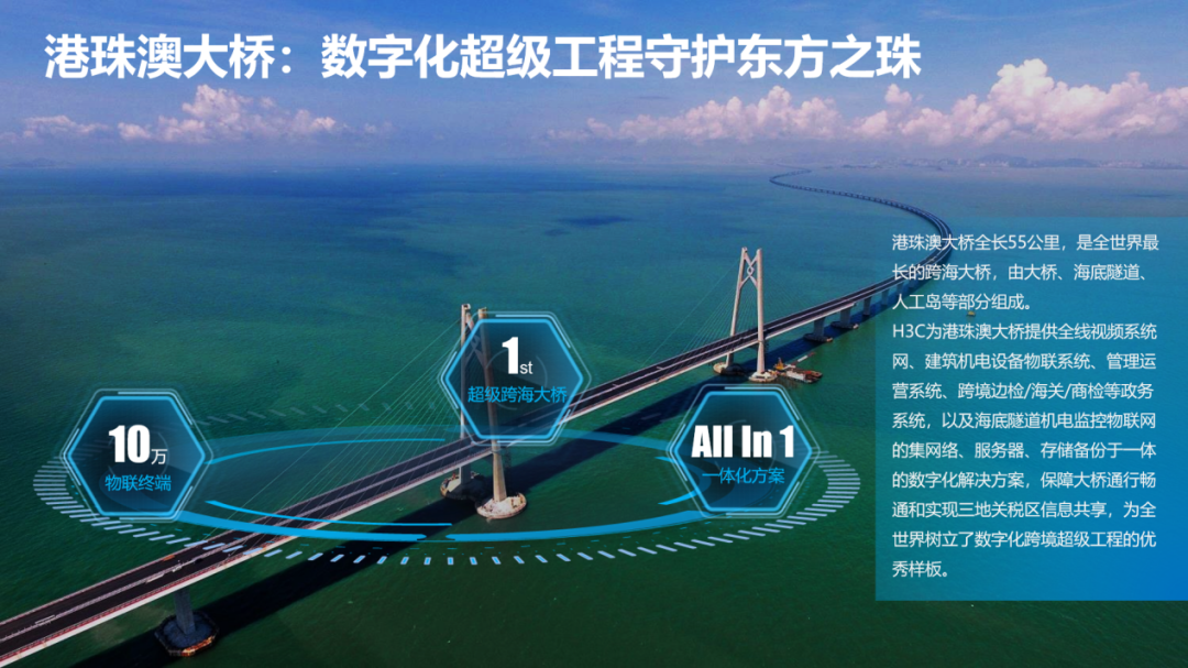 作为世界上最长的跨海大桥,跨越伶仃洋之上的港珠澳大桥东接香港,西接广东珠海和澳门,桥隧全长55千米,其中主桥29.6千米,是粤港澳三地首次合作共建的超大型跨海交通工程。在这座大桥的建设中,新华三集团依靠全栈式的创新实力和在多个跨海大桥建设中积累的丰富实践经验,担当起了港珠澳大桥信息化建设的核心解决方案供应商,承担了大桥90%以上的IT基础架构建设,成功打造了连接港珠澳三地的智能数字化平台,为往来三地的人士提供了仅为8秒的极速通关体验,更进一步让大桥的网络维护成本降低50%,网络安全可靠性提升40%,业务处理效率提升30%,真正做到了创新与成本的融合统一。