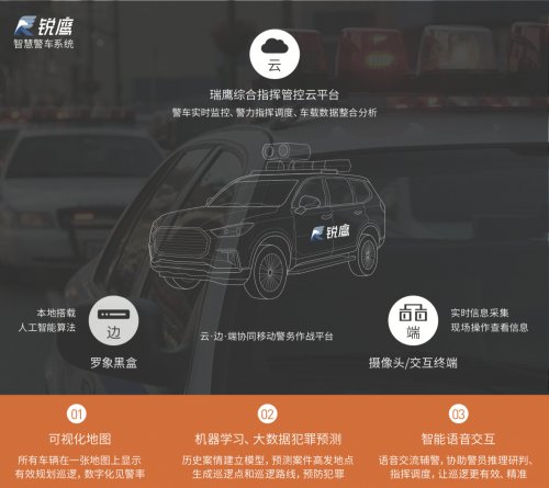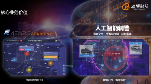 目前海博科技的锐鹰智慧警车系统,是以数据为驱动的深度智能警车巡控系统,已经解决了移动警车设备的视频能力不足、依赖云端、缺少研判推理、缺乏群体智能等问题,增强了警车智慧警务能力,包括区域犯罪预测、巡逻治安盘查、全局指挥调度、警务实战辅助等。