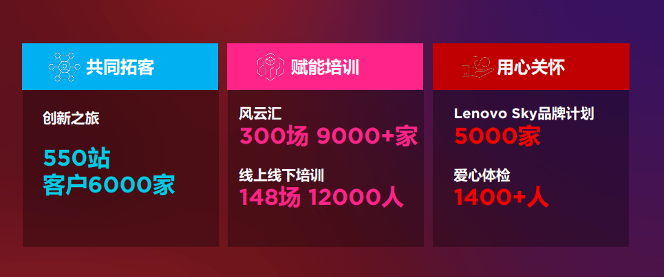 据了解,上半财年,联想共举办了550站“创新之旅”,参与客户达6000家。联想在数字化转型中还持续赋能合作伙伴,通过线上线下形式举办了300场“风云汇”活动,覆盖9000多家经销商,帮助合作伙伴建立了专业的垂直渠道,实现业务的扎根生长。此外,联想将关怀落实到“人”这一层面,用真心、真情连接每一个合作伙伴。其中,Lenovo Sky品牌计划覆盖了5000家合作伙伴,并为1400位合作伙伴员工送去了爱心体检服务。