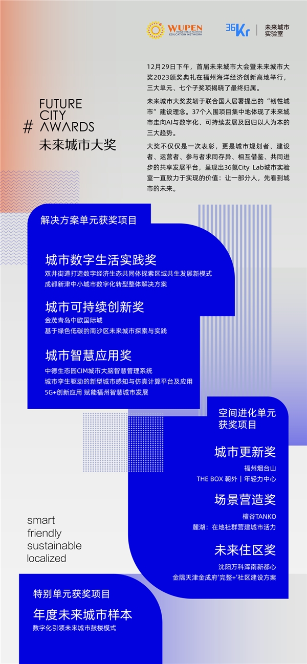 2023年12月29日,首届未来城市大会暨未来城市大奖2023颁奖典礼在主办城市福州的海洋经济创新高地举行,现场揭晓了三大单元、七个子奖项的最终归属。