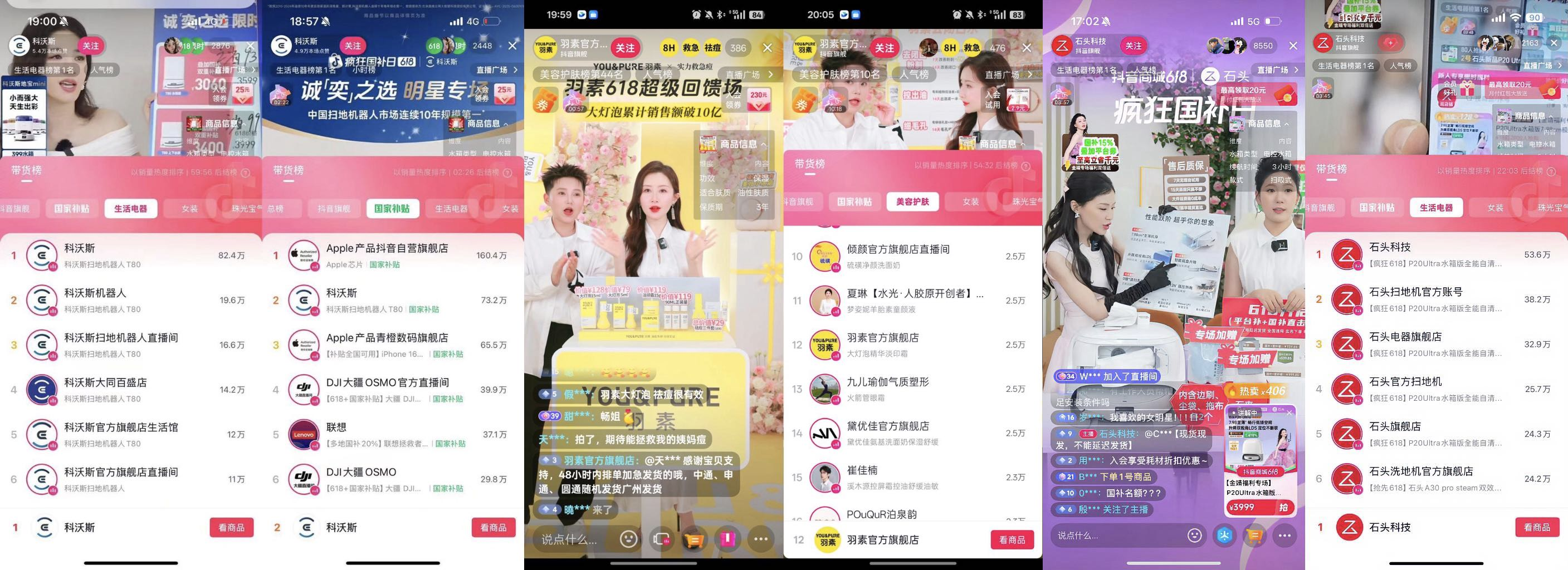 6月11日,黄奕空降科沃斯抖音官方直播间,和粉丝一起聊家庭日常“解放双手”的清洁妙招,带领科沃斯多个直播间霸榜生活电器TOP6、跃升至国家补贴榜第二位,科沃斯抖音店铺总GMV环比日常提升数倍;6月12日,舒畅空降羽素,以好友视角带来“约会急救指南”,将羽素直播间升至美容护肤榜第12名、抖音旗舰榜第29名;6月13日,金靖现身石头科技品牌直播间,凭借喜剧风格与功能化场景顺势种草产品,助力石头品牌狂揽1400万GMV,石头直播间在生活电器带货榜霸榜前14名。