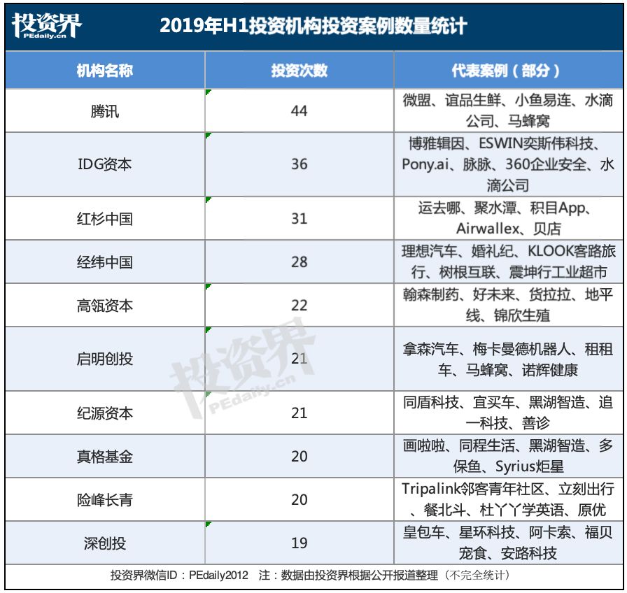 根据公开信息,投资界(微信ID:pedaily2012)对2019年上半年的融资事件进行了不完全统计,梳理出最活跃的10家投资方。