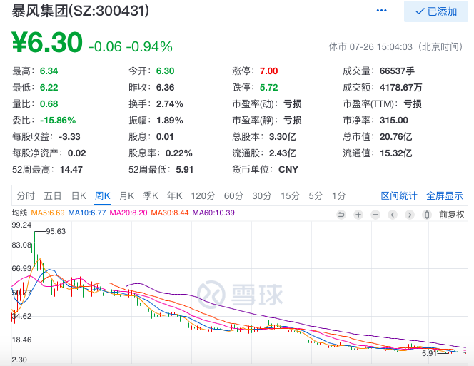 截至7月26日收盘,暴风集团报收6.3元/股,市值仅剩不到21亿元,距离巅峰时期缩水超九成。