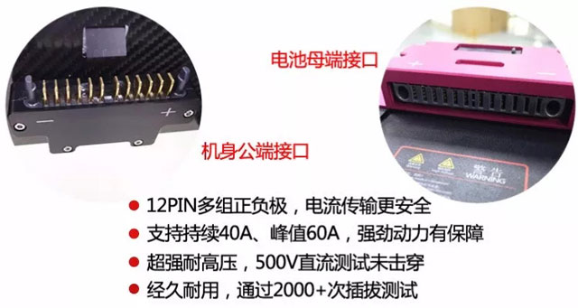 此款大电流接电器接口采用12PIN共六组正负极接口设计,如其中一组损坏仍可正常使用。该接口支持单PIN持续电流40A、峰值电流60A稳定传输,为工业级无人机提供澎湃动力。