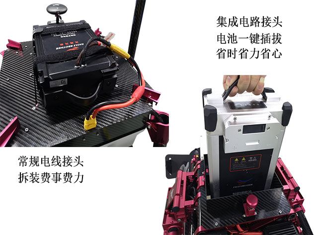 大电流接电器采用模块化设计,在机身与电池端分别植入大电流接电器公端和母端接口,实现了整机的高度模块化和电池一键插拔,电池极速更换,大大提高作业效率,成功解决了常规电池电线插头与接口的难题,厂商无需要开模,节省时间成本,并通用于工业级无人机。