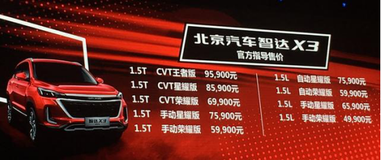 不止于此,智达X3丰富的产品矩阵和良心定价更是直击年轻群体。此次智达X3共推出荣耀版、星耀版、王者版9款车型,价格区间为4.99万元-9.59万元,同级配置下售价均低于业内平均水准,堪称“价格杀手”及“业内良心”。
